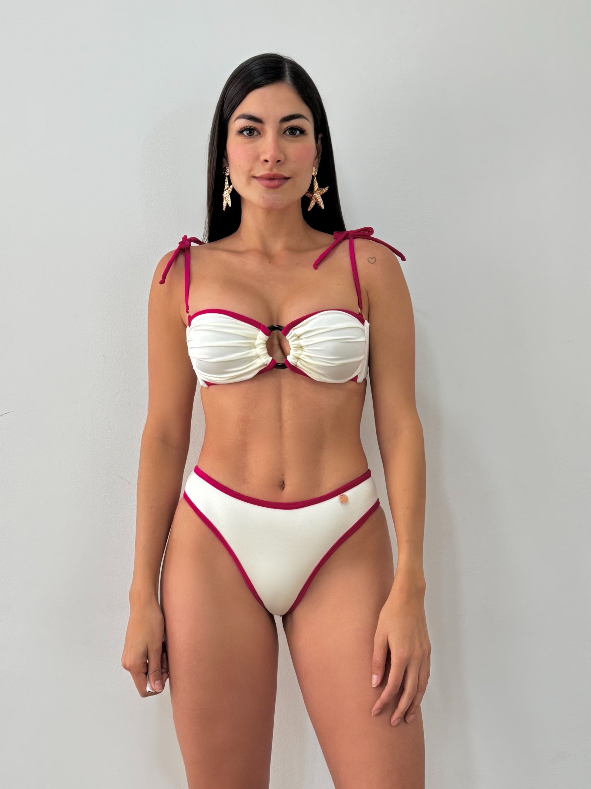 Bikini Roséa es una pieza delicada y femenina que combina elegancia clásica con un aire fresco y moderno. Su diseño en tono marfil con contrastes en rojo aporta un estilo sofisticado y atemporal, ideal para mujeres que disfrutan de los detalles sutiles pero con carácter.