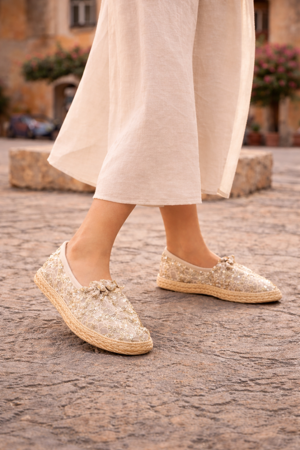 Dorada Encanto Colonial está elaborada en textil bordado con delicados hilos metálicos y aplicaciones de lentejuelas sutiles que aportan un brillo elegante sin perder frescura. Su textura rica y detallada la convierte en una pieza protagonista para cualquier look.