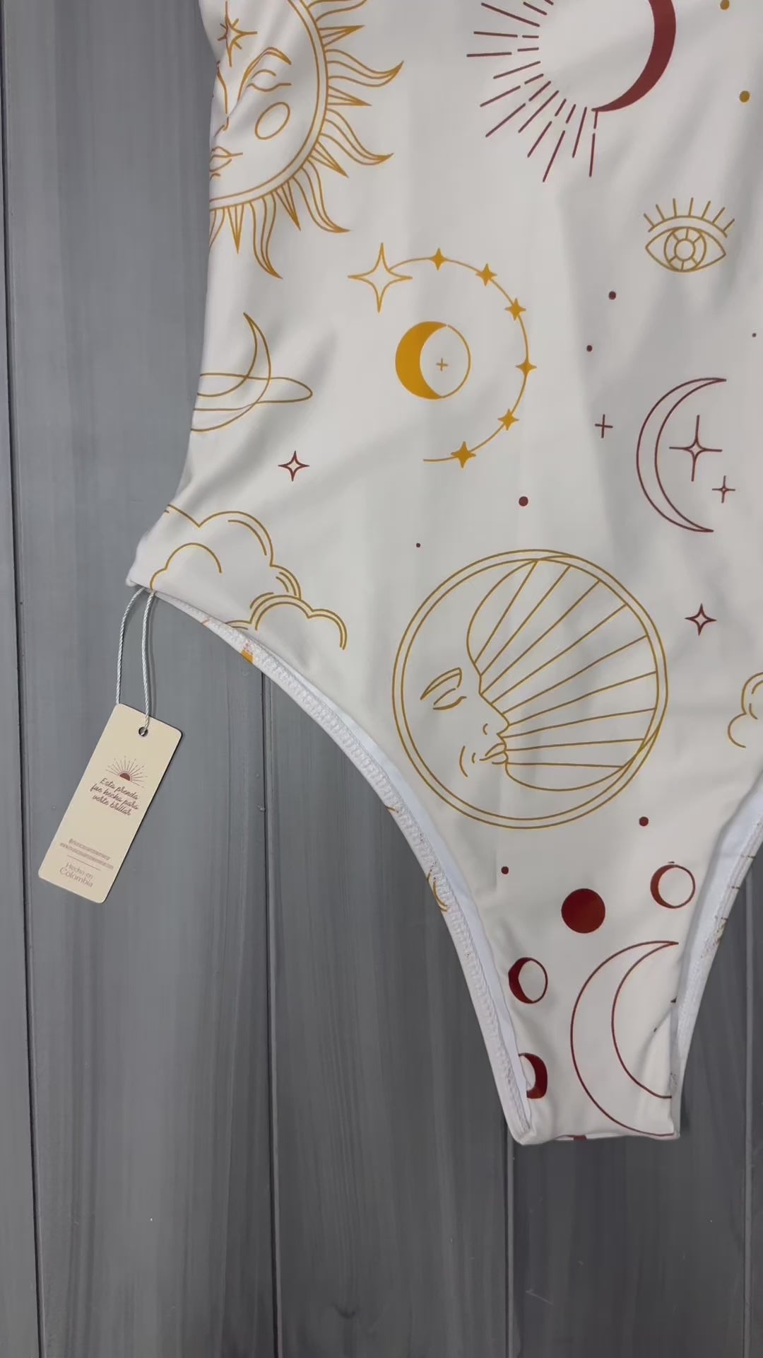 ✨ Brillo Celestial ✨ es un vestido de baño enterizo que te conecta con la magia del universo 🌙✨. Su elegante fondo marfil sirve de lienzo para un delicado estampado de soles, lunas y estrellas 🌞🌛, creando una atmósfera etérea y sofisticada. El toque especial lo aporta el lazo dorado en el hombro derecho 🎀, que no solo añade brillo, sino que también sirve como sujetador, brindando el ajuste perfecto.