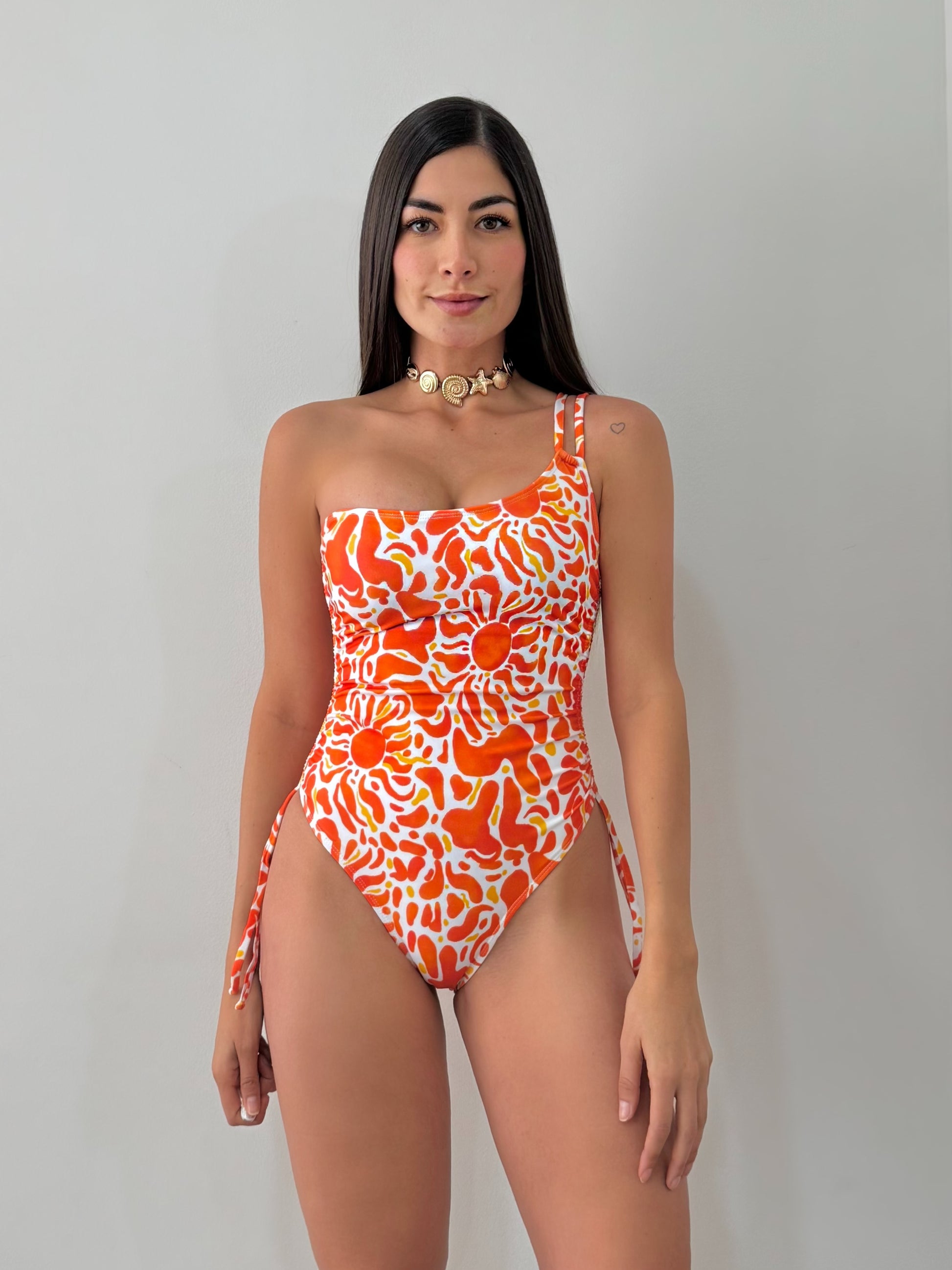 Entero Coralia es una pieza vibrante y sofisticada que celebra el espíritu del verano. Su diseño asimétrico de un solo hombro aporta un toque moderno y femenino, mientras el estampado en tonos coral y naranja ilumina la silueta y resalta el bronceado.